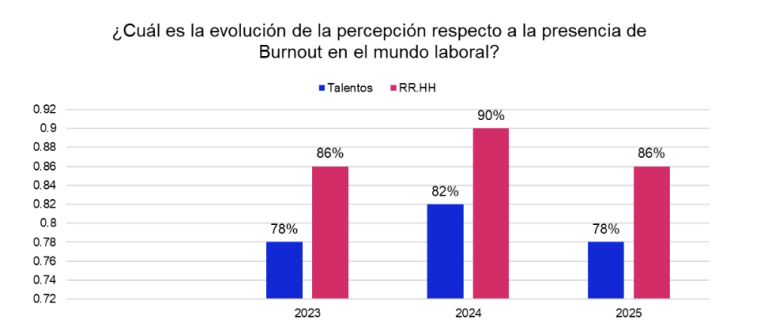 El burnout también es una realidad tangible para los especialistas en Recursos Humanos. De acuerdo con el estudio, el 86% están estresados laboralmente o experimentar el síndrome de burnout. En este caso, la cifra mostró asimismo una contracción respecto al año pasado, cuando afectaba al 90%.